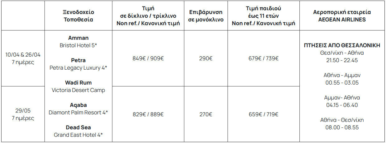 Ανακαλύψτε μια χώρα γεμάτη αντιθέσεις και θαυμαστές εικόνες: το σύγχρονο Αμμάν, η καλοδιατηρημένη Γέρασα και η ξακουστή Πέτρα, συνθέτουν ένα ταξίδι που μοιάζει με ζωντανό μουσείο. Η έρημος Wadi Rum με τα κατακόκκινα τοπία, η παραθαλάσσια Άκαμπα με τα διάφανα νερά της Ερυθράς Θάλασσας και η ιστορική Μανταμπά με τα μοναδικά μωσαϊκά της συμπληρώνουν την εμπειρία, που κορυφώνεται στη Νεκρά Θάλασσα, το χαμηλότερο σημείο της Γης. Ένα ολοκληρωμένο πρόγραμμα με διαμονή σε επιλεγμένα ξενοδοχεία, έμπειρο αρχηγό και ξεναγήσεις σε όλα τα σημαντικά σημεία ενδιαφέροντος. Ζήστε την Ιορδανία όπως δεν την έχετε φανταστεί.