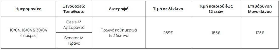 Ένα μοναδικό πρόγραμμα στην Αλβανία, που αποτελεί έναν όμορφο, αλλά και ταυτόχρονα παρεξηγημένο προορισμό της Ευρώπης. Η πολύπαθη και ενίοτε με αρνητική φήμη Αλβανία είναι μια χώρα με πλούσια ιστορία, υπέροχη φύση και μοναδικά πολιτιστικά μνημεία. Με πόλεις που φιγουράρουν στη λίστα της UNESKO, ως μνημεία παγκόσμιας πολιτιστικής κληρονομιάς, αρχαιολογικούς χώρους ανεκτίμητης αξίας και ακτές της Αδριατικής που κερδίζουν διαρκώς την εκτίμηση των διεθνών μέσων ενημέρωσης, η γειτονική μας χώρα είναι ένας προορισμός που θα μας προσφέρει κάτι διαφορετικό από ότι έχουμε συνηθίσει μέχρι τώρα και σίγουρα αξίζει να την γνωρίσουμε καλύτερα. Ειδικά για εμάς τους Έλληνες ένα ταξίδι στην Αλβανία θα μας φέρει σε επαφή και με πολλές ψηφίδες της δικής μας ιστορίας, μια και η Ελληνική σφραγίδα σε πόλεις και μνημεία είναι ιδιαίτερα έντονη.
